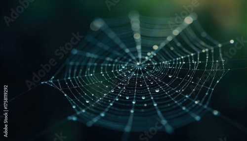 Dew drops on delicate spiderweb threads, glistening like tiny diamonds in the early morning light. Extreme macro photograph of a delicate spiderweb covered in tiny, glistening dew drops. The early