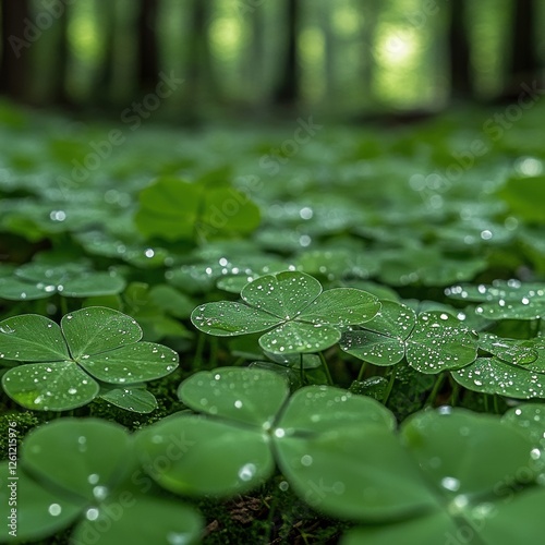 clover, leaf, dew, forest, green, nature, droplet, lush, vibrant, serenity, flora, plant, environment, landscape, calmness, growth, freshness, beauty, close, up, detail, sunlight, moisture, botanical, peaceful, foliage, earth, natural, harmony, ecosystem, wild, summer, spring, refreshing, scenery, verdant, texture, organic, life, rejuvenation, wilderness