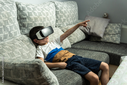 Diagonal image of a dark-haired boy with virtual reality glasses lying on the sofa raising an arm and pointing a finger to the space created in 3D.