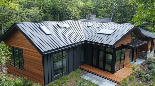 Diagonal view of a modern home's corrugated metal roof with rain gutters and skylights