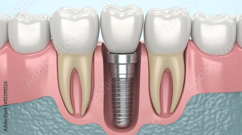 Diagram of a dental implant placed between natural teeth.