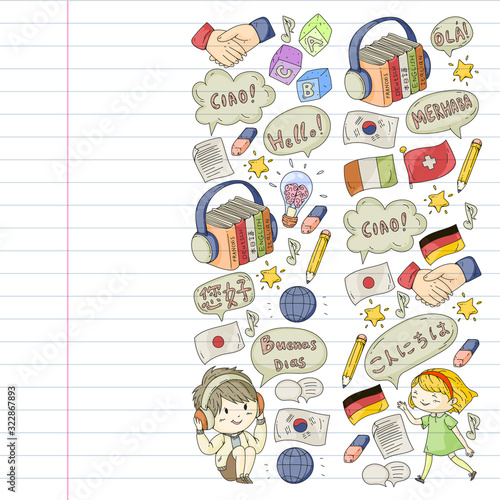 adult, arabic, background, banner, book, bubble, cartoon, chat, children, chinese, class, communication, conversation, course, cyrillic, design, doodle, education, english, foreign, french, german, greek, greeting, hand, hallo, international, cyberspace, italian, japanese, children, language, lesson, online, pattern, poster, quote, russian, school, spanish, speak, speech, talk, holiday maker, vector, web, audio, kindergarten