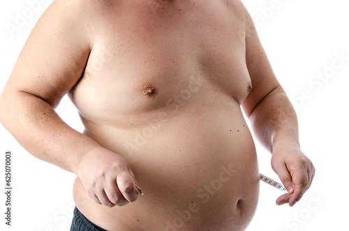 Diet and poor nutrition. Funny fat man posing in the studio.