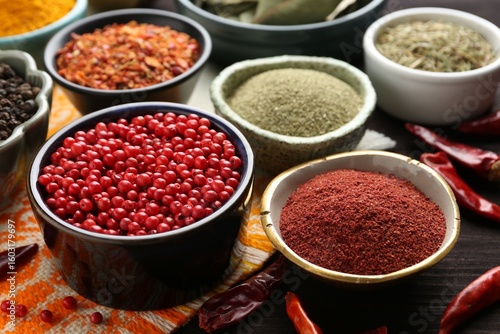 Different aromatic spices on wooden table, closeup