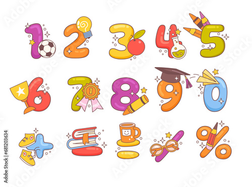 Different cartoon numbers mathematical symbols with comic doodle design set vector illustration