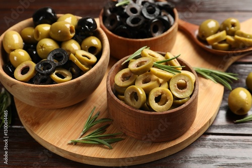 Different delicious marinated olive rings, whole ones and rosemary on wooden table, closeup