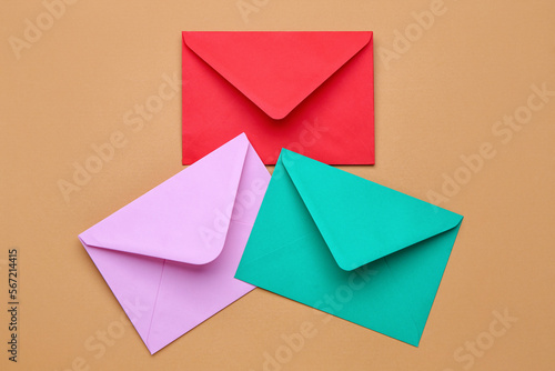 Different paper envelopes on color background