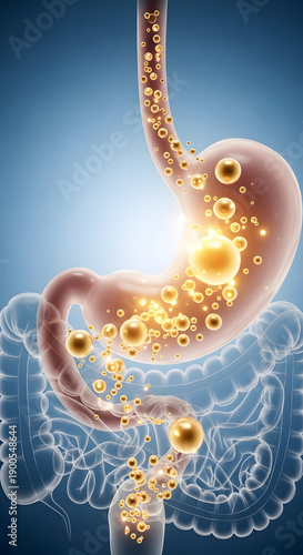 Digestive system anatomy illustration showing stomach and intestines with glowing golden particles representing nutrients or medication being absorbed in a medical science concept