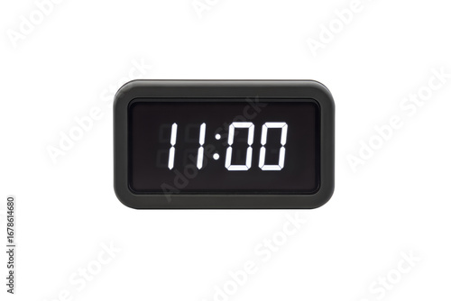 Digital alarm clock with glowing LED display showing 11:00, isolated on white background.