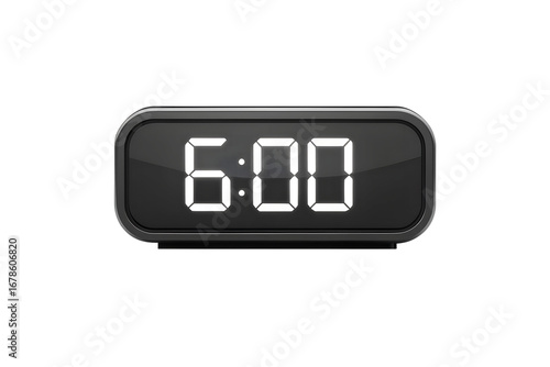 Digital alarm clock with glowing LED display showing 6:00, isolated on white background.