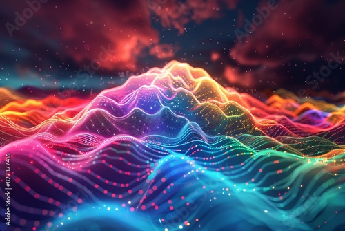 Digital Art: Vibrant Synth Wave Illustration with Colorful Mountain Landscape and Abstract Light Patterns