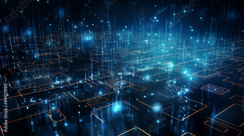 Digital background perfect for tech processes, neural networks, artificial intelligence, data transfer and encryption, digital archives, sound and graphic presentations, science, education, etc