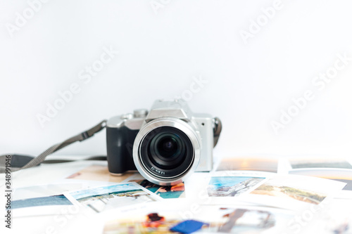 digital camera and 32gb memory card. digital camera on white background and photos scattered on the study table.