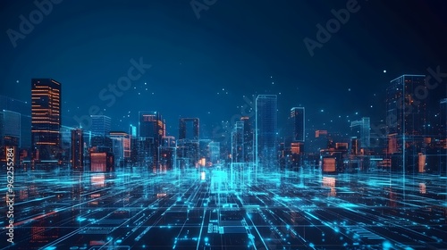 Digital cityscape with buildings made of glowing cubes, representing the futuristic and digital nature of smart urban development