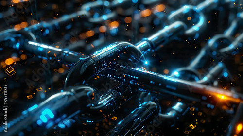Digital code chain representing blockchain 3D rendered intricate metallic links with neon blue highlights futuristic dark background