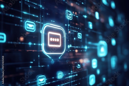 Digital communication concept with glowing chat bubbles, representing online messaging, chatbot interaction, and virtual communication in a futuristic design