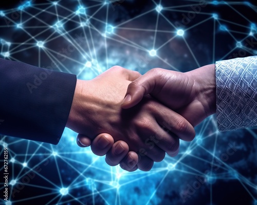 digital cyber business concept with network lines and shaking hands.