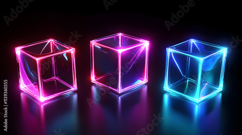 Digital cyber cube. Neon glowing cubes in motion with. Musical, gaming, technology, background with glowing 3d objects.