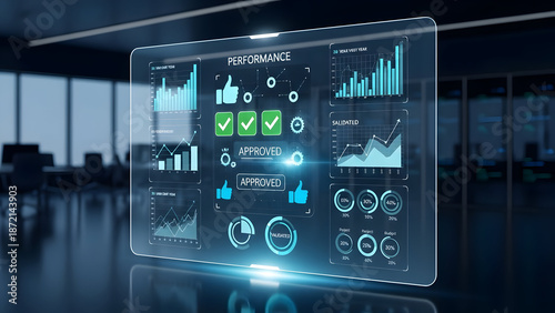 Digital dashboard displaying performance metrics and data visualizations in a modern office
