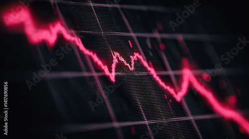 Digital data display with glitch-style red chart plummeting on black-charcoal grid, neon accents, pixel diffusion, 4K ultra-HD contrast, minimalist background and dramatic studio lighting.