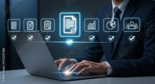 Digital Document Management and Workflow Approval with Holographic Icons – Futuristic Business Concept