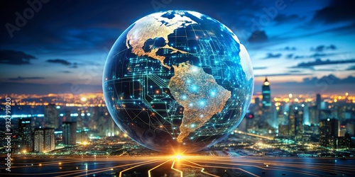 Digital Globe Over Cityscape, Network, Connectivity, Technology, Futuristic