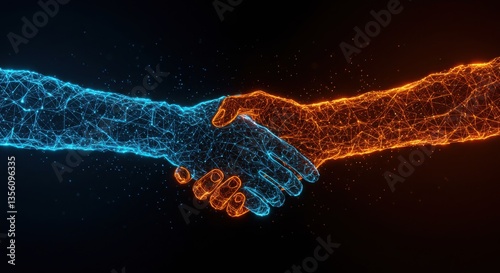 handshake, digital, neon, network, particle, glow, node, connection, blue, orange, contrast, aesthetic, transformation, technology, datum, exchange, geometric, pattern, neural, design, cinematic, lighting, wireframe, abstract, futuristic, concept, art, detail