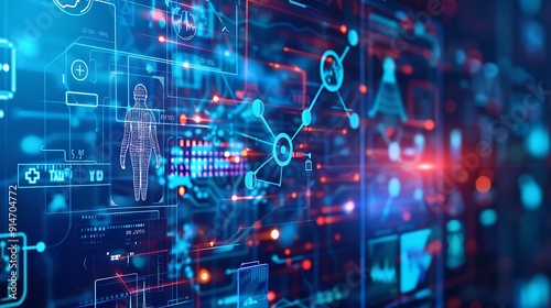 digital, human, body, health, monitoring, system, datum, technology, interface, medicals, futuristic, science, screen, blue, red, cyber, abstract, graphic, design, network, connection, information, analysis, health care, treatment, diagnostic, progress, statistic, artificial, intelligence, innovation, future, modern, concept, virtual, reality, visualisation