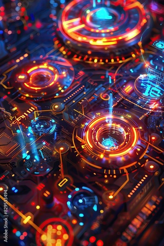 Digital icons of empowerment on a holographic stage background, top view, showcasing motivational technology, digital tone, Analogous Color Scheme