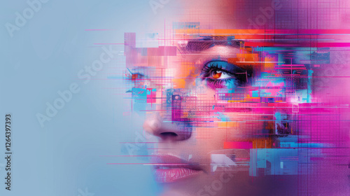 Digital Identity: A captivating close-up of a woman's face, overlaid with vibrant, fragmented digital patterns.