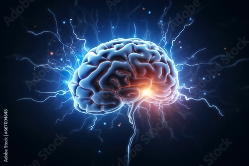 Digital illustration of human brain. Electrical activity, flashes and lightning on blue background. Symbolizes: thinking, concepts, technology, fantasy