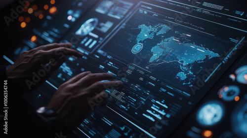 digital interface displaying real time global data with interactive maps and analytics. hands of user engage with high tech display, showcasing advanced technology and data visualization