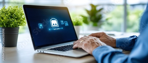 Digital interface with chatbot and machine learning icons displayed on a laptop screen in a modern workspace setting highlighting technological innovation and digital transformation in business