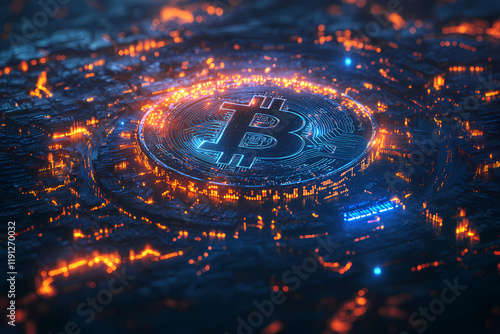 Digital isolated Bitcoin symbol made of glowing blue numbers and letters on a dark background. A concept illustrating cryptocurrency