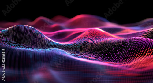 Digital landscape featuring glowing textured waves in vibrant colors at night