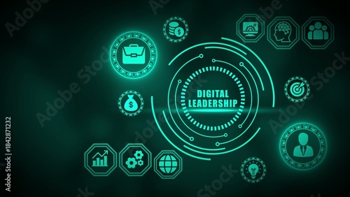 Digital leadership concept with glowing green on dark background glowing green business finance