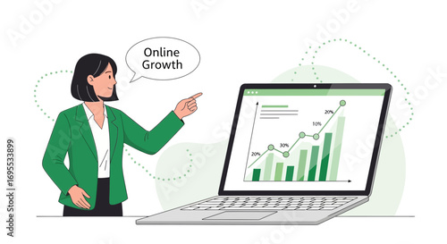 online, growth, business, success, analysis, presentation, progress, marketing, strategy, graph, chart, laptop, computer, datum, diagram, finance, woman, person, pointing, profit, revenue, statistic, increasing, positive, achievement, development, planning, visualisation, technology, digital, representation, illustration, startup, concept, information, communication, trend, design, visual, increase, upward