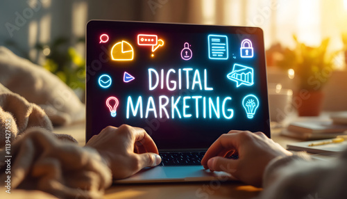 Digital Marketing Neon Design on Laptop Screen, Modern Marketing Tools