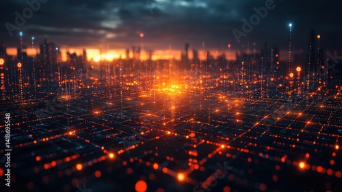 city landscape, futuristic, digital, technology, network, sunset, metropolis, urban, night, glow, light, orange, dark, grid, modern, innovation, datum, information, connection, future, smart, city, building, skyscraper, horizon, science fiction, abstract, illustration, graphic, design, artistic, high-coloured, vibrant, energy, power, illumination, glowing, scene, landscape