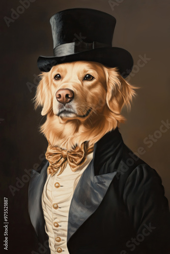 Digital painting of a Golden Retriever dressed as regency gentlemen with a velvet top hat