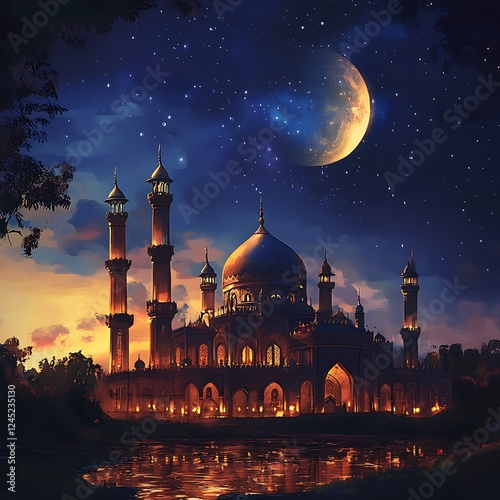 digital, painting, historic, mosque, glowing, night, ramadan, worship, spiritual, faith, holy, heritage, culture, sacred, illuminated, celestial, architecture, traditional, ornate, elegant, radiant, mystical, peaceful, serene, beautiful, symbolic, classic, inspired, decorative, islamic, twilight, warm, glow, harmony, art, aethereal, deep, majestic, serenity