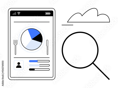 Digital phone screen displaying pie chart, utensils symbol, user profile, and progress bars. Magnifying glass emphasizes analysis and cloud suggests data storage or connectivity. Ideal for health