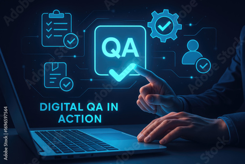 Digital quality assurance concept with hand pointing on virtual screen and laptop