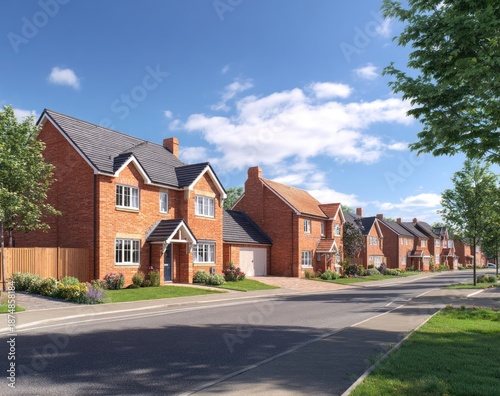 Digital rendering of a residential street, showcasing brick homes with manicured lawns and blue sky
