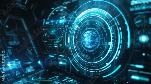 Digital screen with blue holographic HUD and animated interface turning in virtual space with motion graphics background
