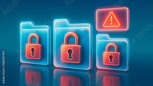 Digital Security Breach Alert: Symbolic depiction of data security breach, with warning signs above locked folders, highlighting cyberthreats, and safeguarding of digital information.
