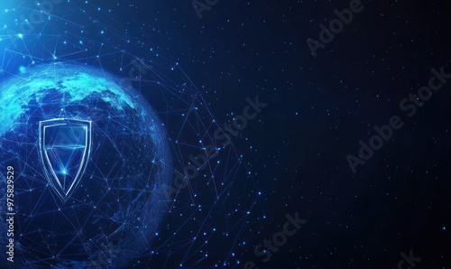 earth, shield, globe, network, digital, technology, datum, security, protection, safety, secure, global, cyberspace, web, connection, communication, online, virtual, abstract, futuristic, graphic, design, blue, dark, space, star, line, dot, light, glowing, gradient, illustration, concept, background, vector, style