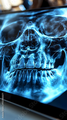 Digital Skull X-Ray, Jawbone and Teeth Structure Analysis, Reveals Intricate Details of Cranial Anatomy.