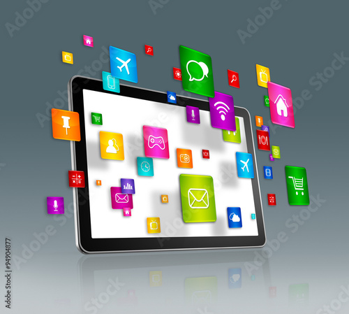 Digital Tablet and flying apps icons