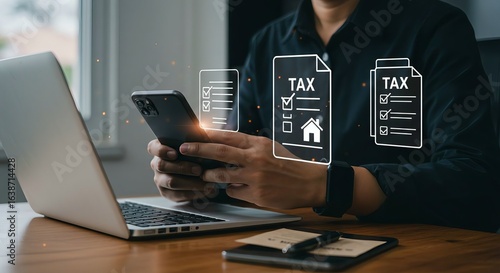 Digital Tax Filing and Financial Document Management: Person Using Smartphone and Laptop with Floating TAX Icons Featuring Checklist, House, and Folder Symbols